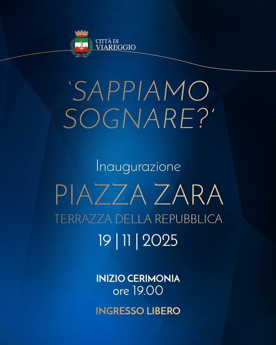 ✨ 200 droni per Piazza Zara ✨📅 Mercoledì 19 novembre, ore 19 📍 Viareggio – Piazza ZaraTaglio del nastro per la nuova Piazza Zara, completamente riqualificata e restituita alla sua funzione originaria di terrazza panoramica sul mare. Un investimento di circa 2 milioni di euro ha ridisegnato uno degli ingressi principali della città, inserendosi nel più ampio programma di restauro e valorizzazione della passeggiata a mare.🌟 A rendere unica la cerimonia sarà uno spettacolo di 200 droni luminosi, simbolo di innovazione e futuro.🔹 Le novità della riqualificazione- Riapertura della vista panoramica sul mare, grazie alla rimozione delle strutture provvisorie.- Nuovo accesso alla passeggiata con scalinata e rampe per disabili.- Fontane rinnovate e arricchite da giochi d’acqua scenografici.- Pavimentazioni ridisegnate con continuità rispetto al tema dell’“onda” della passeggiata.- Installazione artistica di Stefano Boccalini: “Sappiamo sognare?”, un’opera che invita alla riflessione.- Nuovo verde con impianto di subirrigazione moderno ed efficiente.🗣️ Le parole del sindaco Giorgio Del Ghingaro«Piazza Zara torna a vivere nella sua funzione originaria di terrazza panoramica sul mare, restituendo a Viareggio uno dei suoi luoghi più identitari e suggestivi. Una piazza non è solo un luogo fisico, ma un simbolo di rinascita e di visione».✨ Piazza Zara è pronta a tornare protagonista: un dono alla città e a chi la ama.